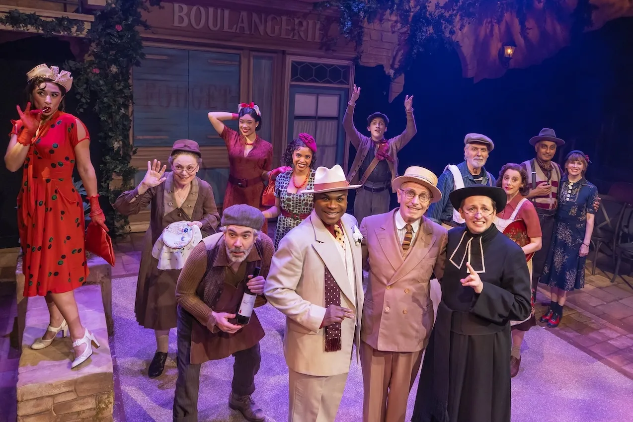 While it is unrelated to the figure of the Baker’s Wife in the fairy-tale musical Into the Woods, this show does have the air of a fable. An expert and affable baker, Aimable (Scott Bakula)—his name means lovable–moves to a Provençal bourg in the 1930s, to the delight of its hungry inhabitants; beside him is his new bride, Genevieve (Ariana DeBose), an attractive woman decades his junior. For Genevieve—her name starts with jeune, i.e. young—Aimable is a rebound from a bruising affair with a married man. But although she has married for stability, her eyes can’t help wandering to make contact with those of the strapping Dominique (Kevin William Paul), a singing nonesuch of hunkiness who works as a chauffeur for the hedonistic Marquis (Nathan Lee Graham, pillowed by a trio of nubile young “nieces”). Dominique drives Genevieve wild; they run away, and poor Aimable is left holding the baguette.