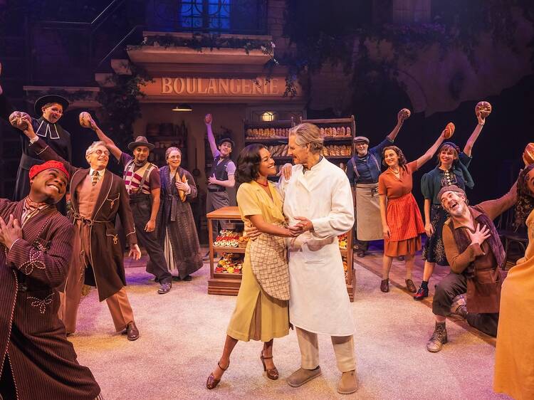 Bakula, who is best known for such TV shows as Quantum Leap but began his career in musical theater, is cast against type as the homely and doting baker: He is handsome and trim, and looks good in linen pants. Compensatorily, he is older than the usual Aimable—at 71, he’s more than twice DeBose’s age—which adds a poignant sense of perspective to the naiveté of a character who, having spent his youth tending to an ailing mother, is belatedly taking a shot at romance. His songs have been taken down a few keys, but what he lacks in jolly exuberance, he makes up for in weedy dignity. As the object of his tendresse, DeBose requires no transposing: She delivers The Baker’s Wife’s most famous song, the guiltily lustful “Meadowlark,” in the original key, and blasts out its climactic E. But beneath her fallen-angel hardness, she finds a vulnerability that makes her seem worthy of Aimable’s love. If Paul’s vocals don’t have quite the strength of his physique, he is a persuasive object of lust, and the show’s revised take on Dominique makes him a more appealing foil: less arrantly caddish, more callowly ardent. In his own vain fashion, he too is carried away.