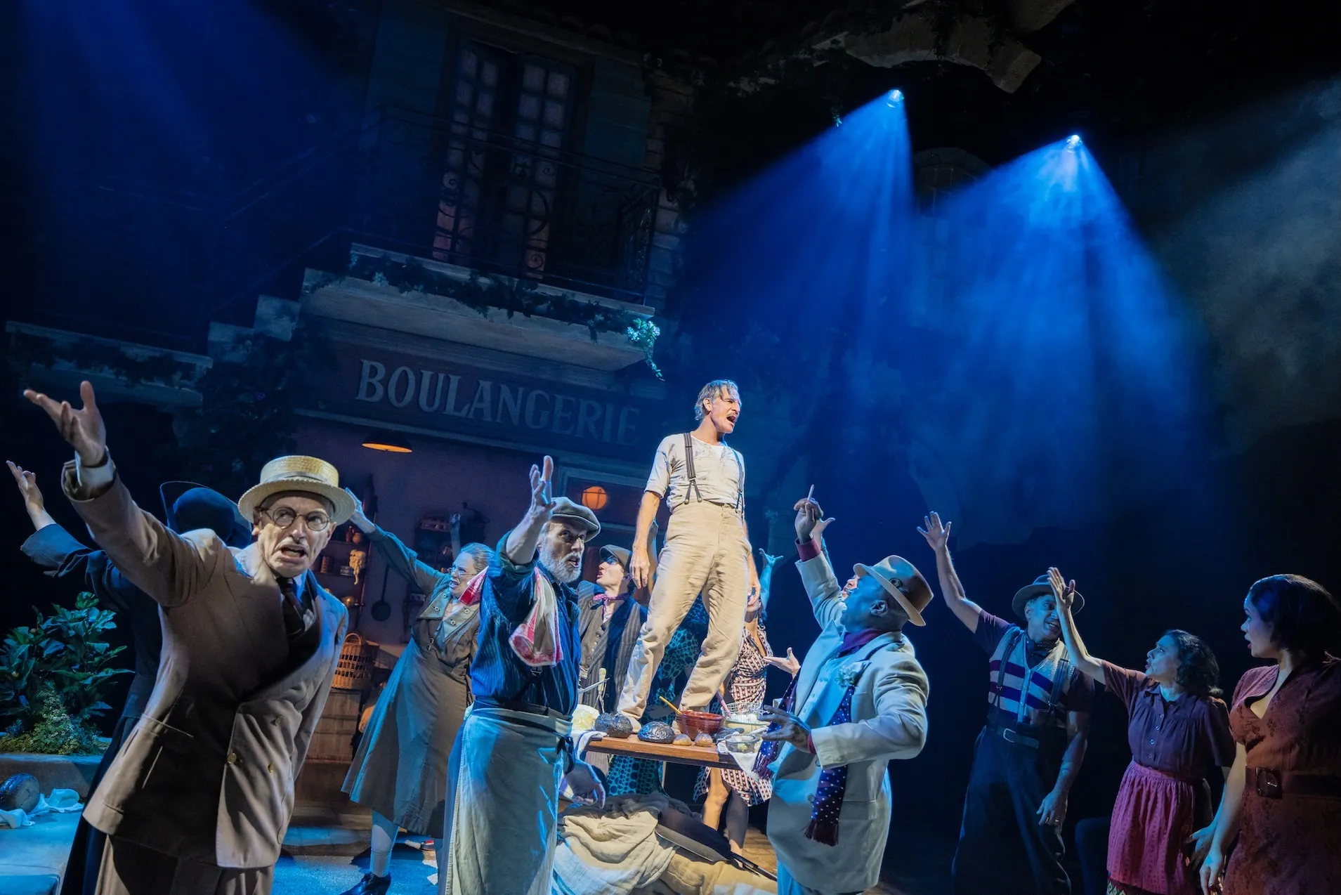 To focus on this love triangle, however, would be to miss the far richer geometry that Greenberg’s production helps bring out. This larger picture may surprise those who know the show mainly from its 1976 cast album with Paul Sorvino and Patti LuPone, which was recorded with a full orchestra—led by Schwartz himself on piano—but only four actors. That meant cutting a great deal of the score, and it created the impression that The Baker’s Wife was primarily about the central trio. In fact, and especially in this latest iteration, the musical is just as much about the rest of the village, which must learn to move beyond its habitual internecine squabbling to work together toward the common goal of getting Genevieve back to Aimable and Aimable back to his job.