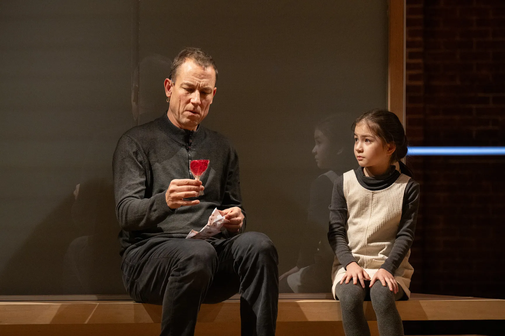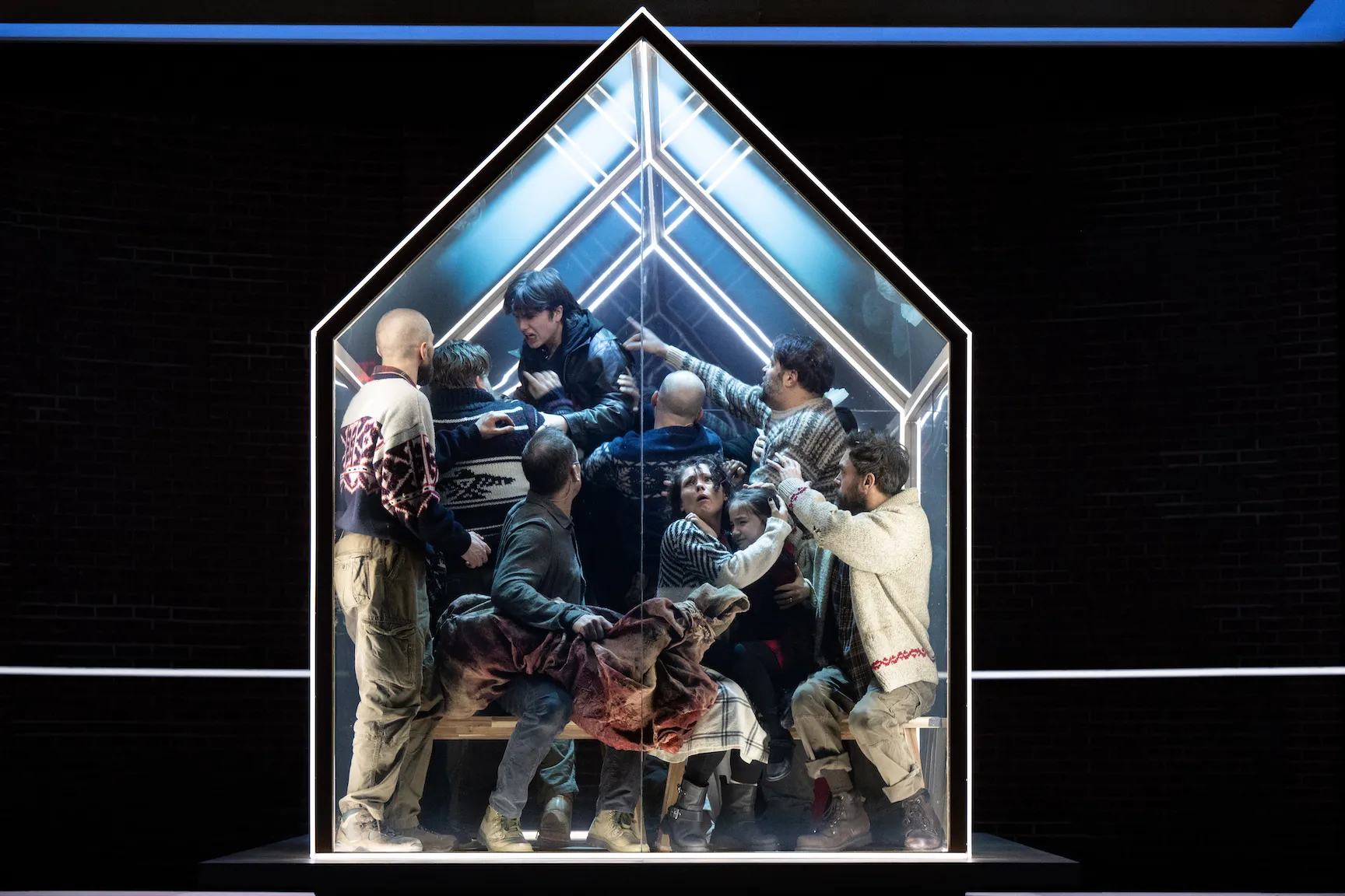 The centerpiece of Rupert Goold’s production, which has moved to St. Ann’s Warehouse from London's Almeida Theatre, is a small and suffocating glass house into which a multitude of town scenes—tense homes, cramped offices, packed churches—are discomfitingly stuffed. Scenic designer Es Devlin (The Lehman Trilogy) specializes in glass boxes; here, the tight encasement is smartly used to suggest both individual isolation and the lure of social conformity. Goold’s muscular staging establishes a tight-knit community with violence lurking at its edges: The local hunting group, heavy-drinking and heavily armed, chants and stomps in Kel Matsena’s frightening movement work. Flashing glimpses of a minotaur-like figure suggest the fine line dividing the hunters from their prey.