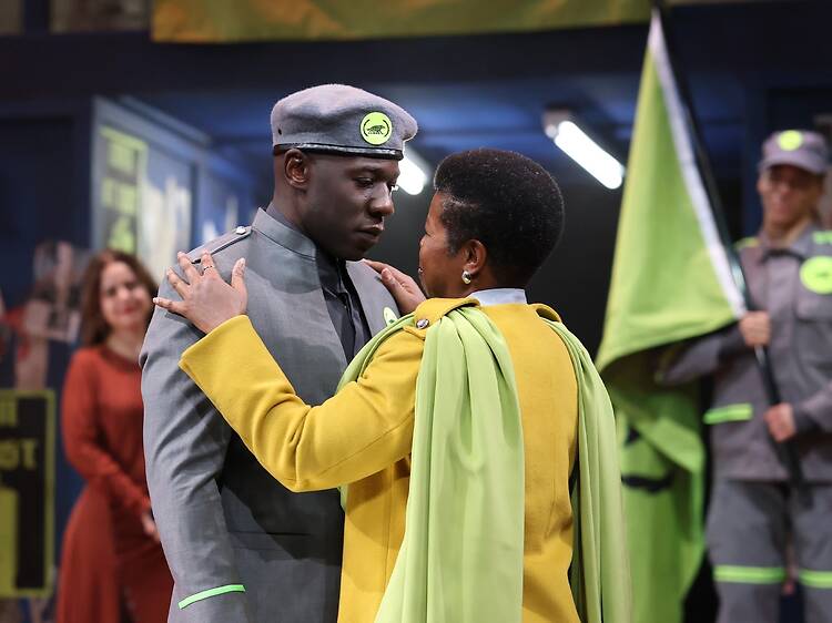 “He’s losing it.” “PURE MELTDOWN.” “I love watching his ego collapse in 4K.” These could be social-media comments on a Senate hearing, and indeed they are—but in Ancient Rome, not the United States. The current production of Shakespeare’s The Tragedy of Coriolanus at Theatre for a New Audience is a blend of the contemporary and the classical. A columned pantheon and a live video feed both overlook the stage in Afsoon Pajoufar’s spare multilevel set, and McKinley Belcher III gives modern spins to the title character’s modes of masculinity: the cocky bro, the momma’s boy, the war hero who falls from grace. Shakespeare charts a clear rise and fall for his doomed protagonist, and Belcher surfs those waves exuberantly.