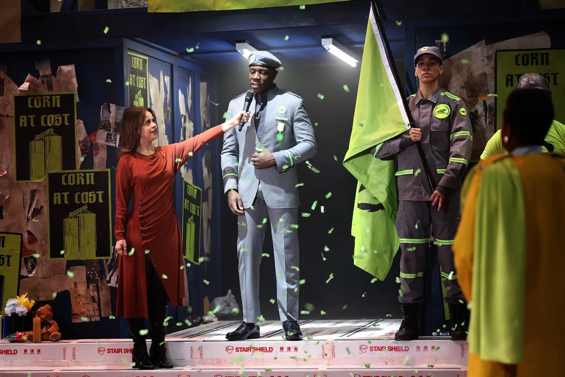 Jason O'Connell, as the Roman senator Menenius, speaks with a dynamic musicality, descending from deferential to desperate as he struggles to control the increasingly unwieldy general. The female roles are mostly afforded less range—gentlewomen Virgilia (Meredith Garretson) and Valeria (Emma Ramos) are little more than props in our antihero’s emotional arc—but Coriolanus’s mother, Volumnia, is a full and imposing figure. As embodied by the commanding Roslyn Ruff, Volumnia is an iceberg: cool and sturdy, with a power that looms beneath the surface. Powerful women have long guided men behind the scenes, but in this production, one of them also becomes an adversary: Tullus Aufidius, Coriolanus’s blood enemy. Mickey Sumner schemes, seethes and slays in the role—and it is she, not he, who gets the last word when the bright Roman candle sputters out.