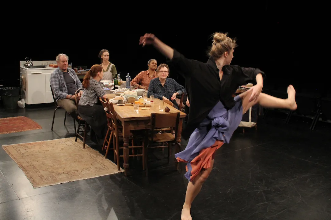 The audience sits in two rows on all four sides of the playing space, and for nearly two hours without intermission we are invited to act as flies on the wall for the characters’ discussions of Rose: her work, her death, the division of her estate, that time Merce Cunningham gave her flowers. On the night I saw What Happened?—September 8, 2021, which is exactly when it takes place—there happened to be an actual fly buzzing around Jason Ardizzone-West’s welcoming set, which has no walls, but I daresay this fly wasn’t there for the dialogue anyhow; more likely, it was drawn by the lasagna that is prepared and consumed in real time over the course of the play.