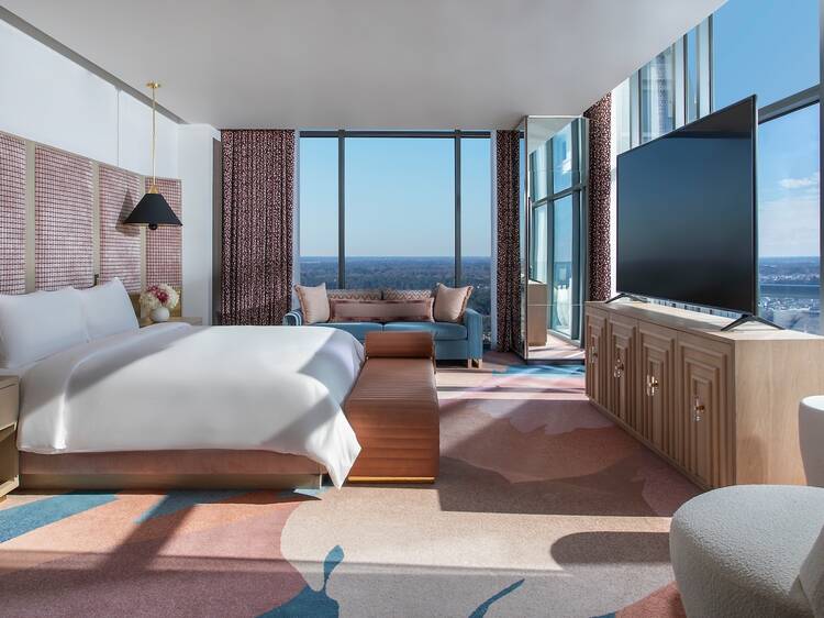 A tech lover’s—and lazy person’s—dream. Rooms are spacious and decked out with innovative amenities like Toto Neorest toilets (with heated seats that warm your bum), automated controls for blackout shades and lights, and smart-tinted windows that block UV rays. Not to harp on the toilets, but an unexpected warm seat after a long day of travel is pure decadence.