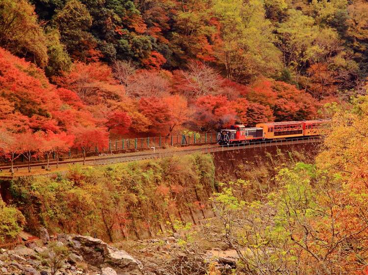 If you’re tired of temple-hopping for autumn foliage in Kyoto, here’s a much more enjoyable autumn leaves experience. Step aboard the Sagano Romantic Train, a breathtaking sightseeing ride through one of Kyoto’s most picturesque river valleys.