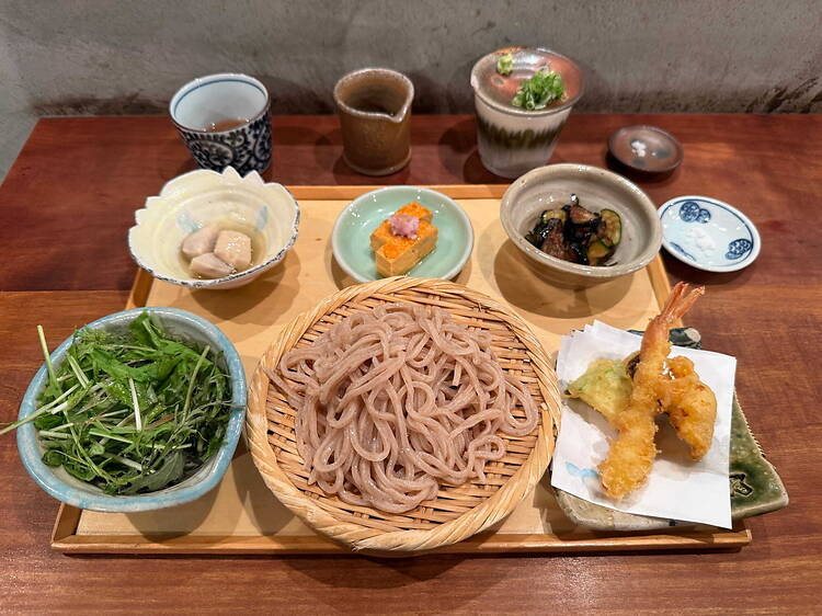 On the menu, you’ll find the aforementioned coarse-ground whole-wheat udon alongside a blended version that’s closer to regular udon. The former is the reason Aozora Blue holds a Bib Gourmand rating, and it’s revelatory in both texture and flavour. Also worth watching out for is the rare special where chef Matsui showcases seasonal ingredients, such as perilla leaf, in his ‘speciality’ udon.