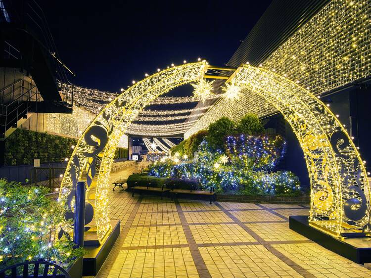 One of Osaka’s most unique shopping centres, Namba Parks uses lights to create larger-than-life landscapes. The 18m-tall Waterfall of Light cascades from the 9th floor down to the 2nd, while a glowing ‘forest of lights’ welcomes visitors at the Parks Garden entrance. On the 8th floor, a giant full moon projection comes alive with digital fireworks and playful animated rabbits.