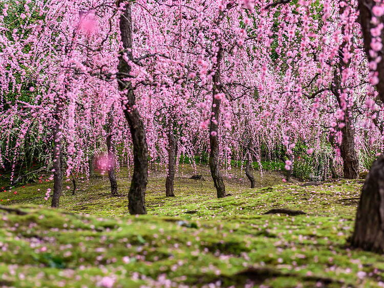 Jonangu features five separate gardens, and the one to its west, named ‘Haru no Yama’ (‘Spring Mountain’), is home to about 150 weeping plum (ume) trees. The best time to visit is during full bloom, when the drooping branches are heavy with pink, red and white flowers.