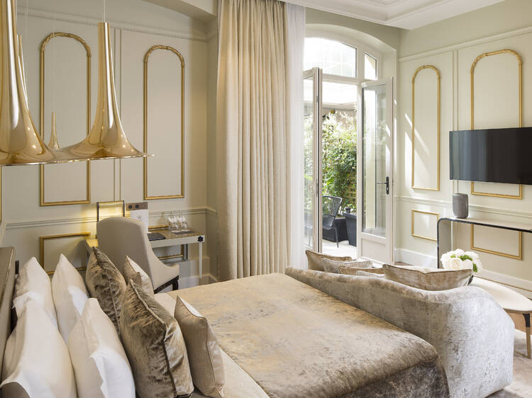 The 37 rooms open onto a tree-lined courtyard or onto a patchwork of Parisian rooftops, but all promise space, serenity and a chance to switch off. The hotel makes a virtue of not bedazzling you with stunning views as the focus is completely inwards: it’s almost a meditative space, but with nothing monastic about the low-key luxury. For the full Emily in Paris experience, Suite Aurore embraces views of the Eiffel Tower from its private terrace.