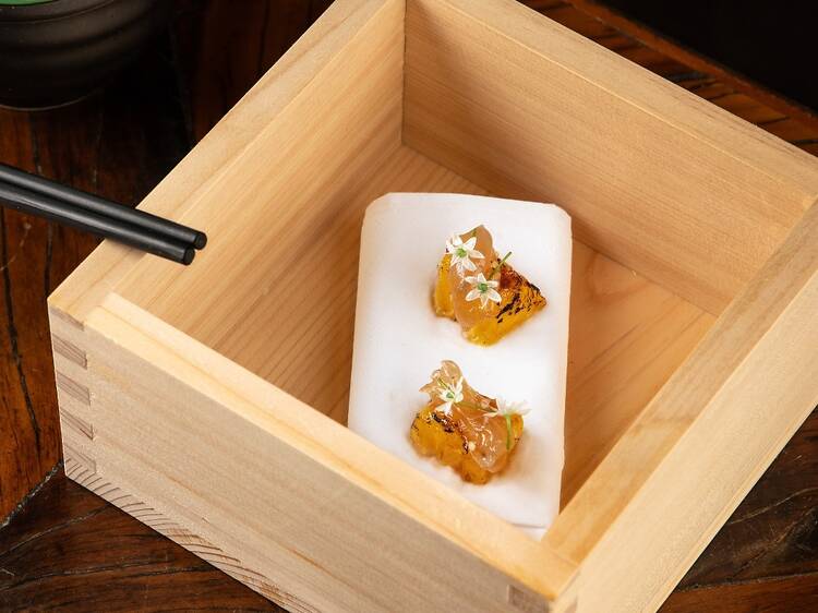 Na sugestão da casa, vem servida depois da ostra levemente braseada no saquê e vinagrete de nirá e do sushi de pargo selado na manteiga de missô.