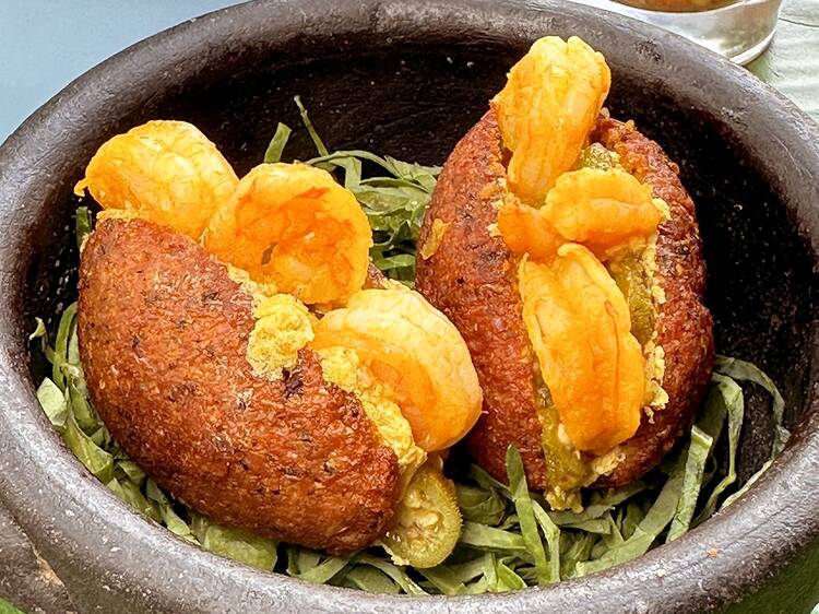 Naquela cozinha afetiva e contemporânea, marcada pela valorização dos ingredientes nacionais, das matrizes africanas e da força espiritual que atravessa sua trajetória, vai ter acarajé (R$ 25, a dupla) e ipeté (R$ 50), feito com purê de inhame temperado com azeite de dendê, camarão seco e cebola, e enfeitado com camarões frescos.
