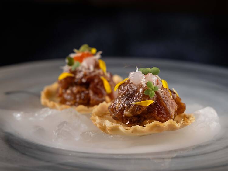 E vamos às massas, algumas com o destaque que merecem. O tartellette de atum (R$ 65) vem com muçarela e pérolas de limão, finalizado na mesa com nitrogênio, pilar da gastronomia molecular, para criar outras texturas. O sorrentino de queijo (R$ 98), chega puxado no camarão, escoltado de aspargo, tomate cereja e fonduta. O camarão também está no agnolotti (R$ 92), com alho poró e fonduta thai.
