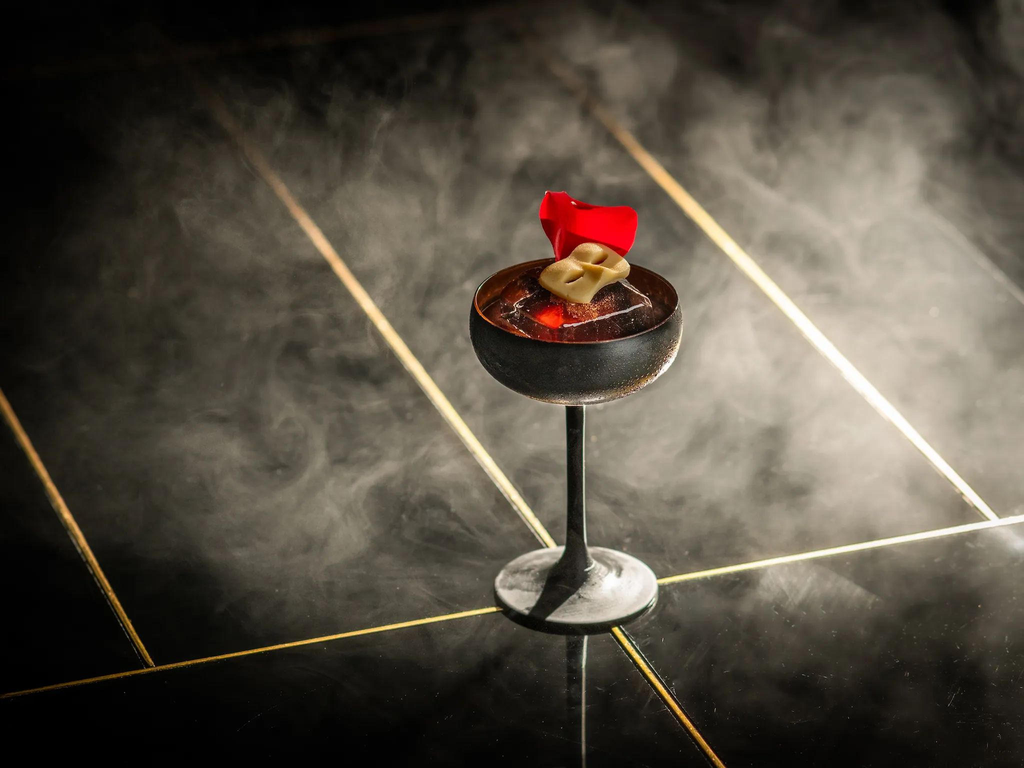 The digestif-style, Cognac cocktail Razzle Dazzle ($28) pays homage to Chicago, with bitter melon and hibiscus-infused Pierre Ferrand 1840 cognac, black sesame-infused Mancino Chinato vermouth, and Luxardo Espresso liqueur, and spritzed tableside with gold dust.