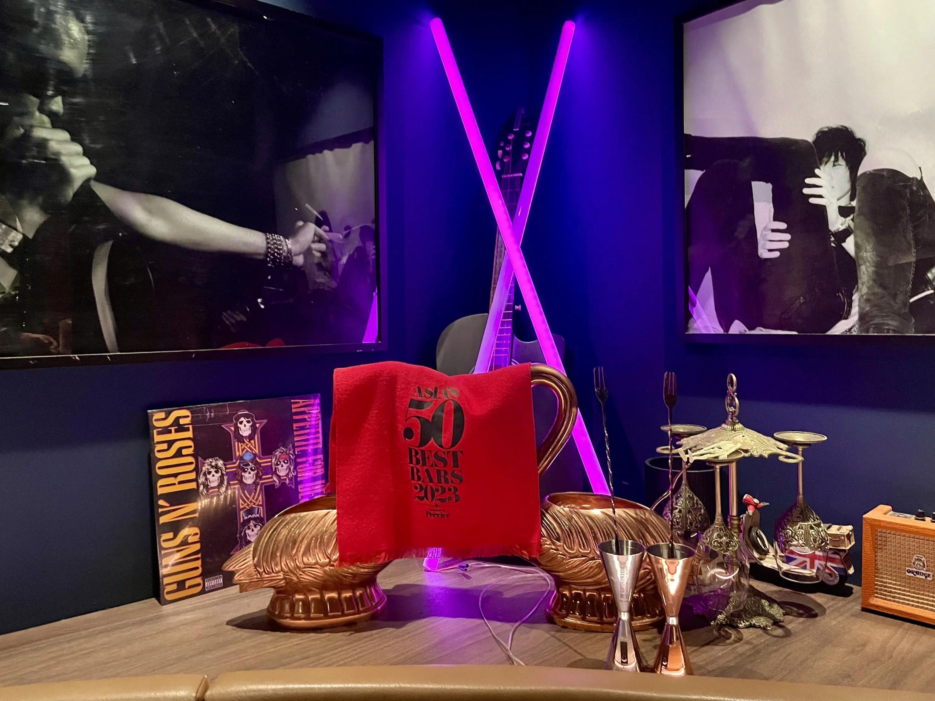 The back room is pure rock ‘n’ roll theatre: think framed portraits of guitar heroes, vinyl sleeves, and even a leather jacket immortalised on the wall. Look closely and you’ll even spot a red Asia’s 50 Best Bars banner draped up – a humble little reminder that this joint is no stranger to accolades.