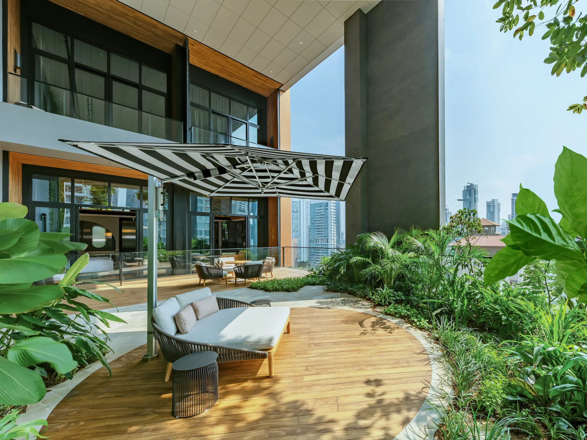 One fascinating tidbit about Artyzen Singapore is that it's built on prime estate formerly occupied by Villa Marie. It was a 1940s era mansion built by Tan Hoon Siang, a keen horticulturalist and relation of philanthropist Tan Tock Seng. His love of plants, and particular interest in orchids, has been woven into the fabric of Artyzen Singapore. You see it in the bold floral motifs stamped throughout the hotel lobby, in the arched trellises that drip with plants and gems alike, and in the green and tranquil sky gardens across the floors.