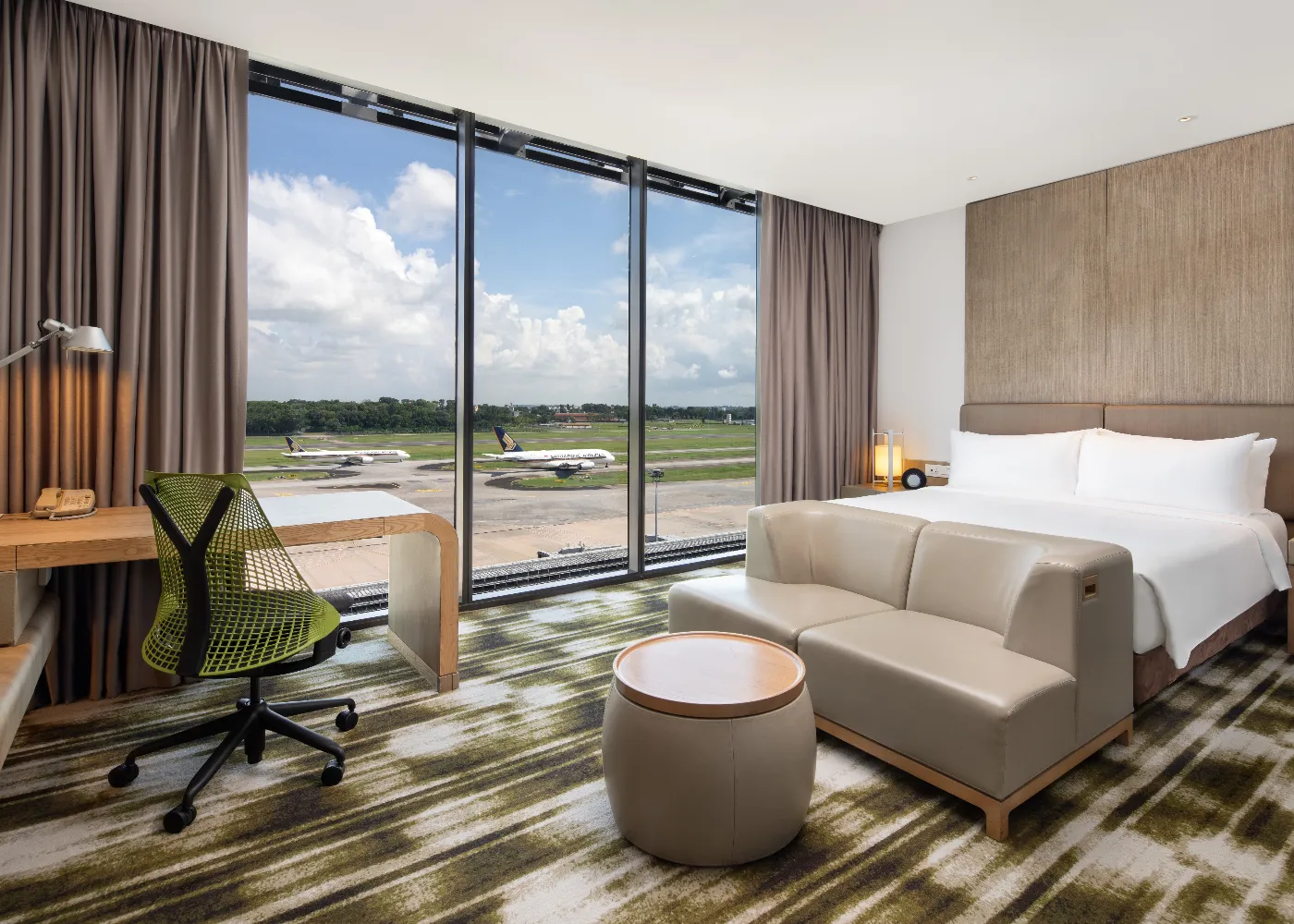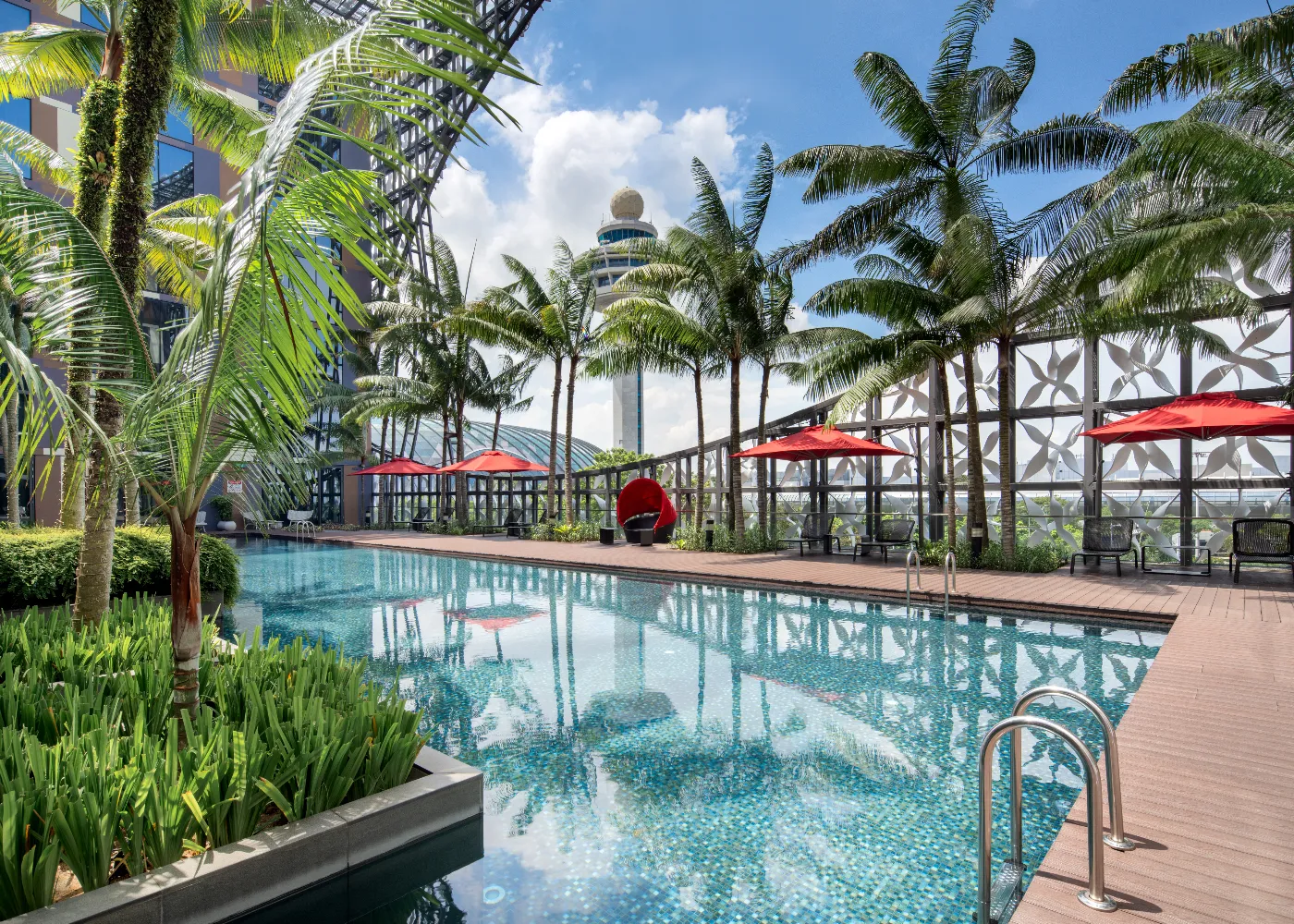 Beyond the rooms and restaurants, the hotel has all the trimmings: a resort-style outdoor pool with a view of the iconic Changi control tower, a well-equipped 24-hour gym, business facilities, and even rainforest-themed event spaces.