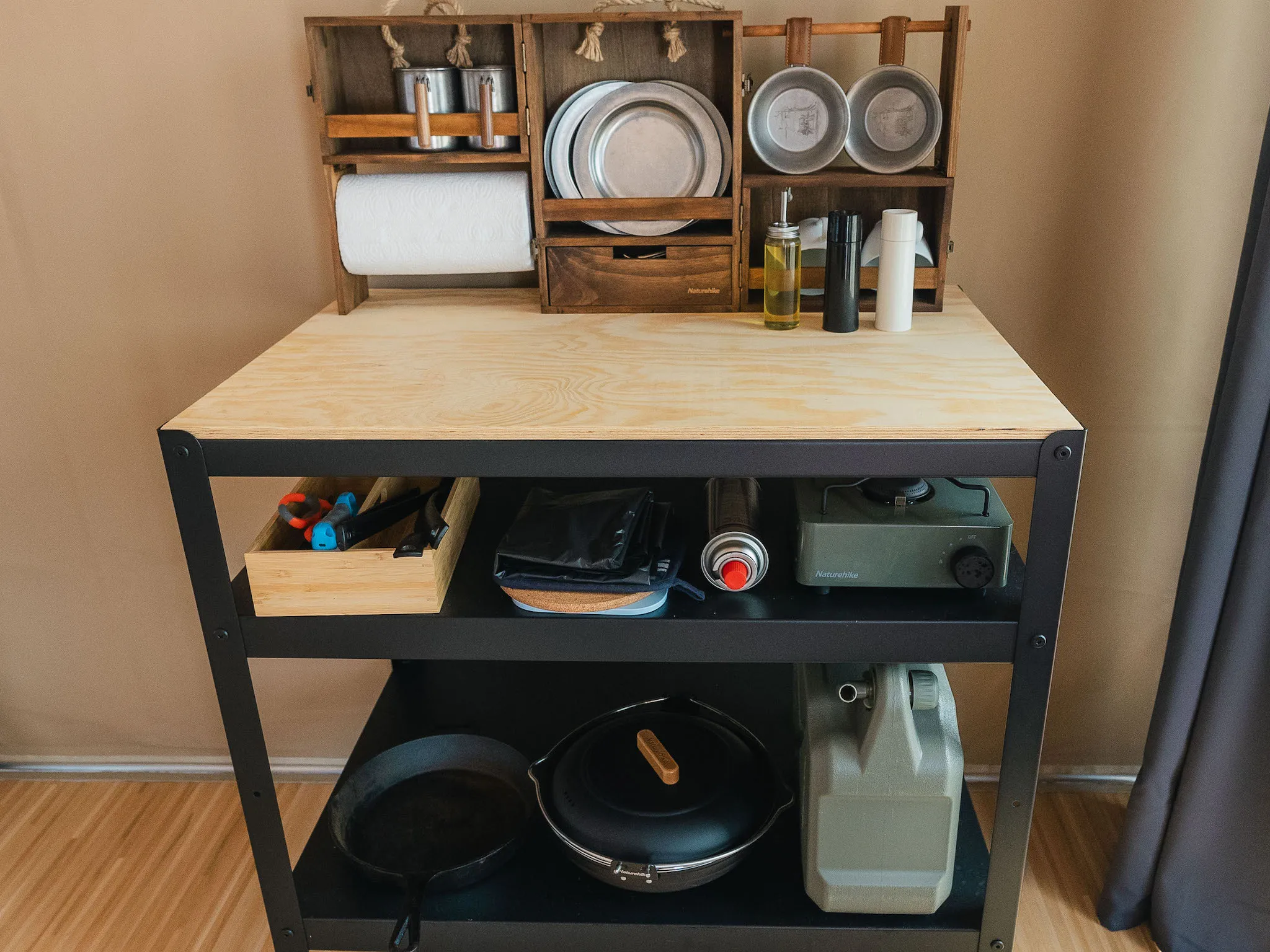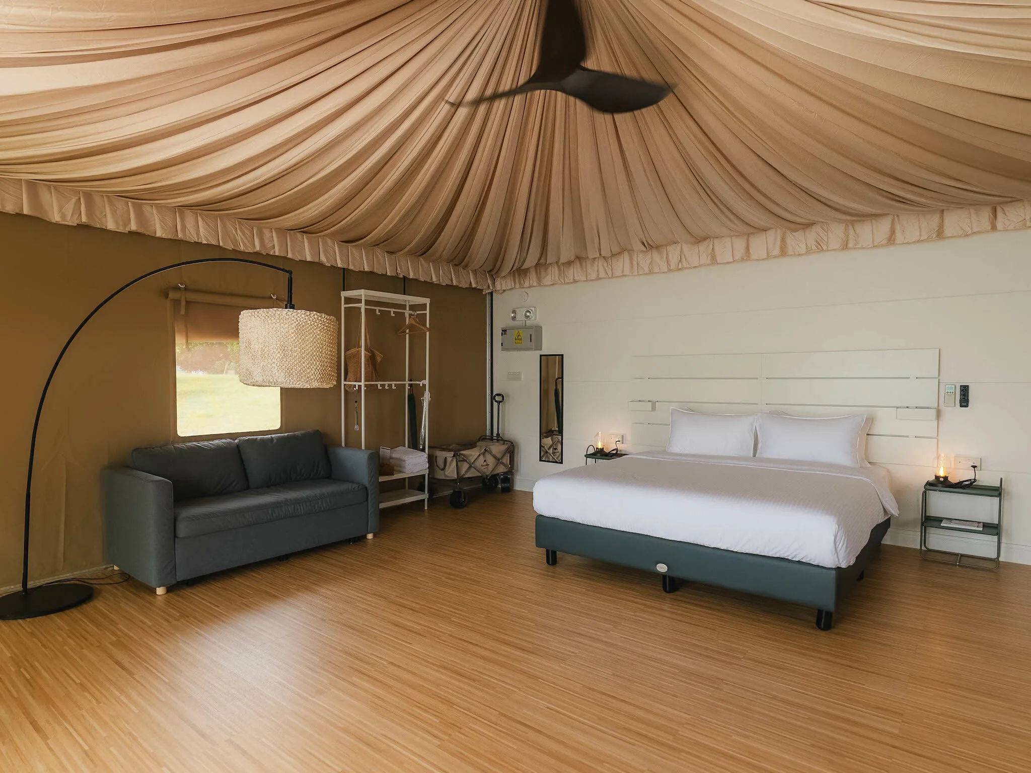 Where the 'glam' part of the vacation comes into play is in these rooms. On a one-night stay with Into The Woods, we checked into a family tent and found a whole lot to love. It's spacious and fully air-conditioned, with a king bed and a sofa bed to accommodate a family of four. Full-length glass sliding doors offers views of the beach – the glass is tinted so you can look out at the waves from the inside while staying shielded from anyone outside who might be looking in (in any case, there are curtains that you can draw for extra privacy). The room has a snack bar stocked with cereals, biscuits, coffee, and tea, a small fridge and microwave. There's even a little kitchenette filled with outdoor cooking essentials – a gas stove, lighter, cast iron pan, stew pot, cutlery, and basic condiments like salt and oil.