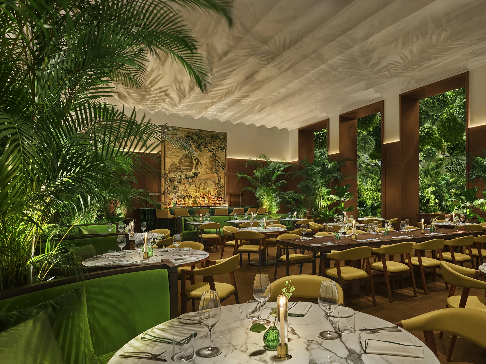 The design of the restaurant is just as arresting: soaring ceilings, chartreuse velvet booths, Calacatta marble and of course, lots of plants.