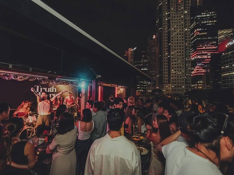 Truth or Dare joins the company of plenty of other rooftop bars around the CBD, but the main draw is that the space comes alive with live music every single night, and DJ sets every Wednesday, Friday and Saturday. To get here, you'll first need to locate The Offshore Building, then enter via the back alley and head up to the top floor. Evenings start mellow, relaxed and quiet, but by sundown, the energy amps up, the music gets louder, and the drinks stronger. This duality is also evident in the cocktail menu, which comprises four tipples (from $15) under the sections 'Truth' or 'Dare', from a gentle gin, osmanthus and burnt honey concoction to a heady vodka and brown butter number. Or, you can go for the Bartender's Choice ($20), which combines whisky, sweet ginger wine, azuki red beans and evaporated milk. The food menu is straightforward, with bites like nuggets and truffle fries, to heartier plates of kimchi fried rice and chilli crab linguine.