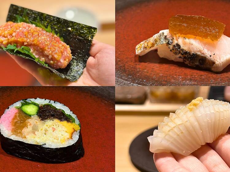 As the blackthroat seaperch is served, we are encouraged to press it down gently with the back of our spoon to release a small trickle of natural oil that seeps into the rice beneath. A shame, though, as by this point in the meal, we're too full to appreciate its richness. And by the time the futomaki (giant roll) arrives as the finale, we are properly stuffed. We gamely polish off the hefty slice anyway, stuffed with a colourful medley of seven ingredients, including kegani (hairy crab), kuruma ebi (tiger prawn) and more.