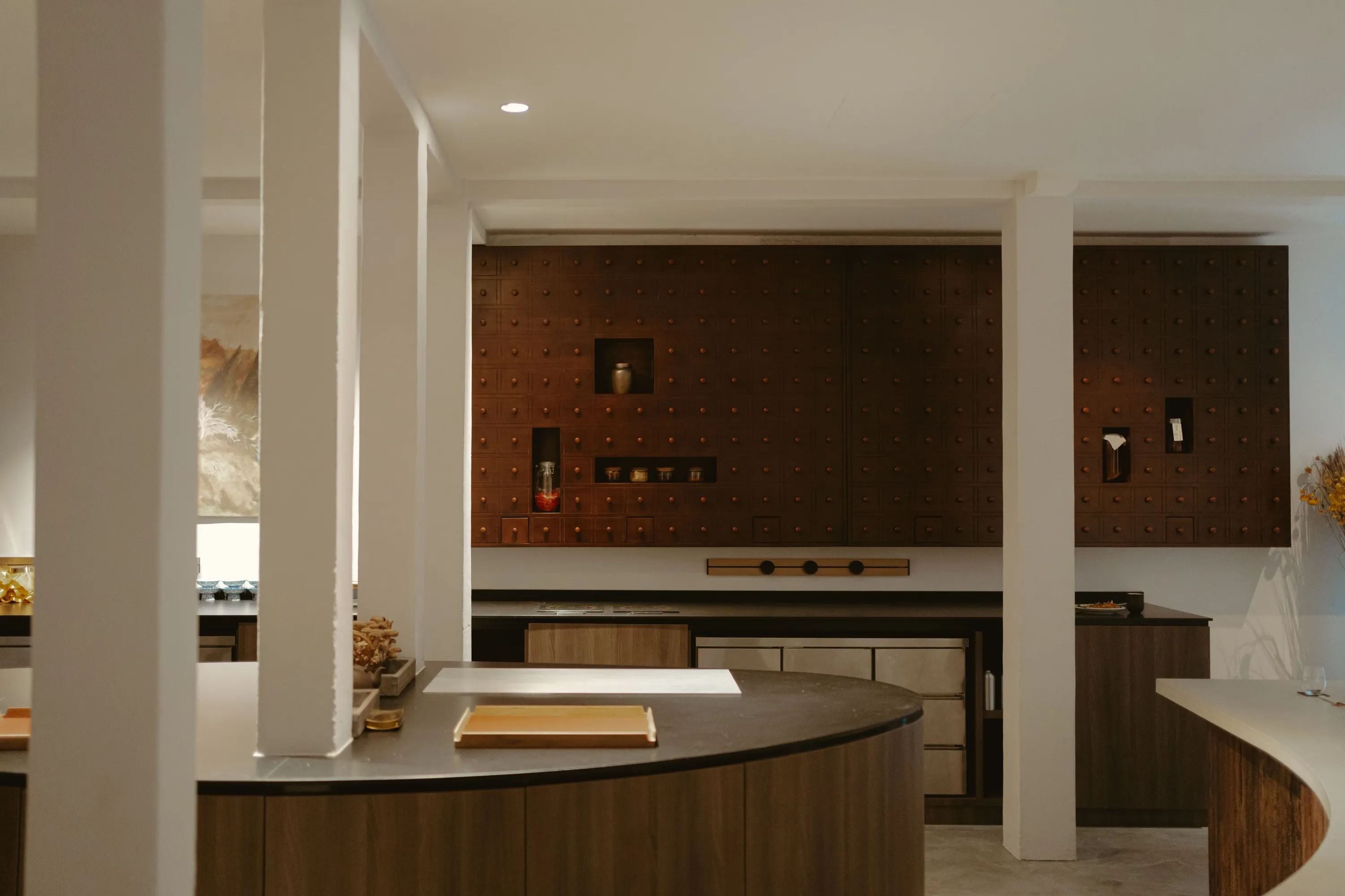 The space at Asu is often described as ‘monastic’, and understandably so. It’s washed out in white, concrete, and oxidised bronze, complete with simple wooden furnishings. And then there’s the atmosphere as you step in – a curious, calm, yet inviting one, like a prelude to the meditative experience that’s about to follow. The first thing that catches the eye is a sweeping dining table that surrounds the open kitchen like seats in an amphitheatre, almost as if setting you up to watch a performance.