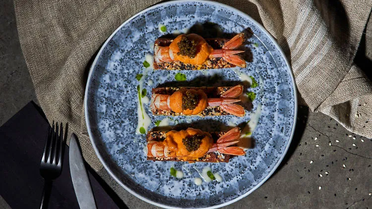 The food served is also full of surprises – and textures. Crispy hasselback potatoes come crowned with lime-marinated bluefin tuna ($16); catfish taco is almost gelatinous, sweetened with umeboshi mayonnaise ($16); and noodles come made from squid ($25), served in an umami-rich brown chicken broth. More uncanny pairings feature heavily on the modern menu, too. Humble toast ($58) comes smeared with scallop mousse, then topped with bountiful catch from the sea: prawn, uni, and caviar. But it all comes together most evidently in the restaurant’s star dish, a whole Sichuan BBQ fish ($42). Sea bass comes grilled with tongue-numbing spices, then drenched in a lobster-based sauce perfumed with XO and laksa herbs.
