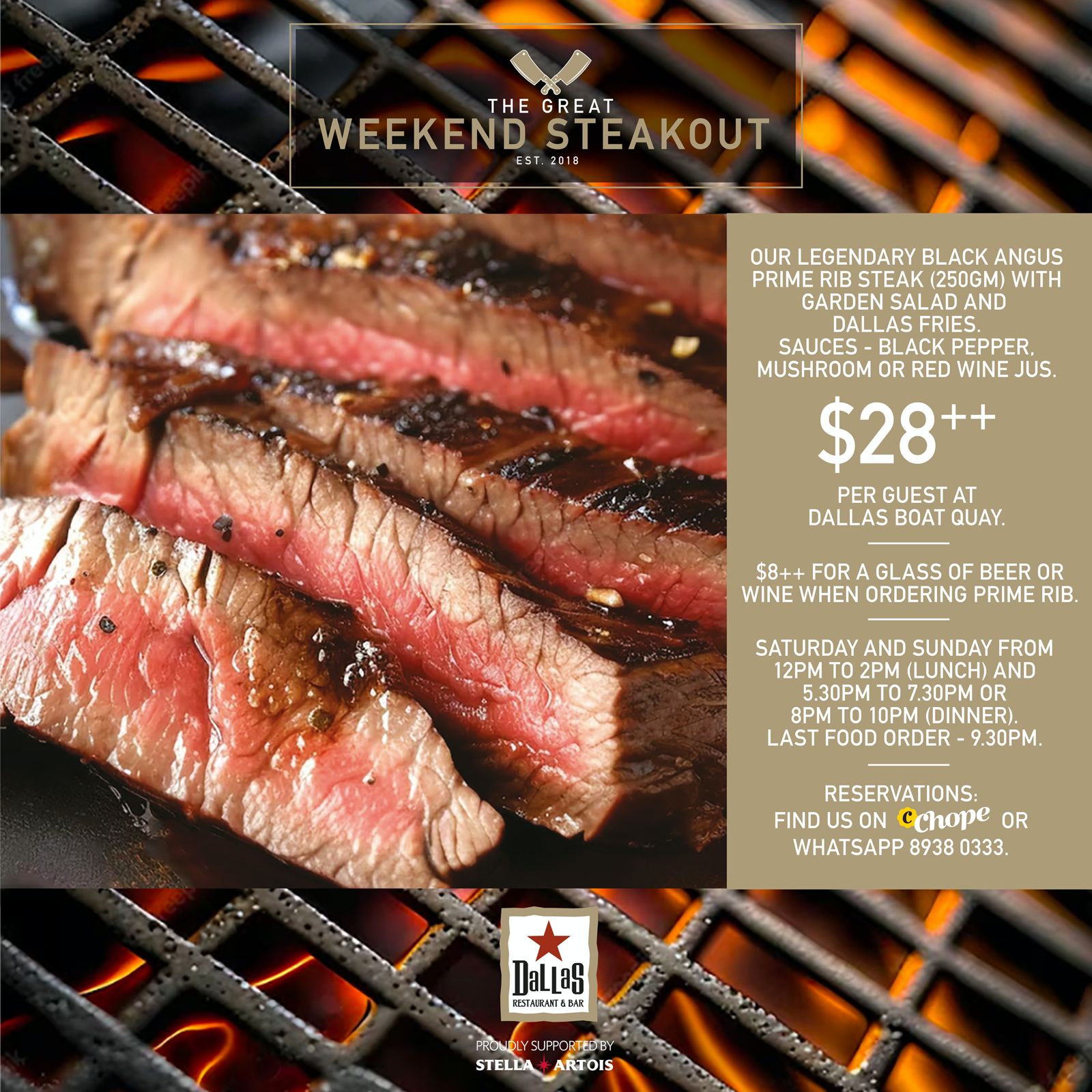 Make your way down on weekends for The Great Weekend Steakout, an amazing bang for your buck for those craving a juicy steak. For just $28* (U.P. $48), you'll be feasting on a Black Angus prime rib steak with a fresh garden salad and Dallas fries on the side. This hefty 250g prime rib cut has been slow-cooked and chargrilled for maximum flavour. Choose from sauces like black pepper, mushroom, or red wine jus. This deal is only available on weekends for lunch (12pm to 2pm) and dinner (5.30pm to 7.30pm; 7pm to 10pm). You can make a reservation for The Great Weekend Steakout here or WhatsApp 8938 0333.