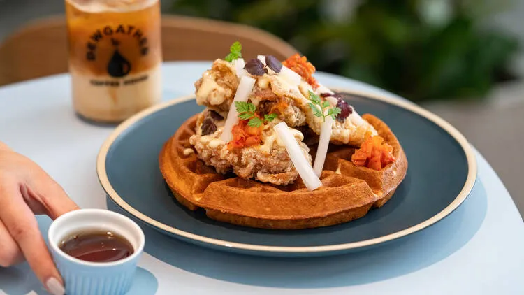 Classic café grub comes tinged with Asian influences to present novel options worth ordering. Strands of linguine ($27) come perfumed with a herb-scented sauce, with pops of baby capers to add tang and brightness to the dish. Fillets of swordfish make for a hearty, meaty bite. The usual waffle and chicken ($20) get a makeover as well. Korean-style fried chicken, which comes with a thinner coat of batter, tastes lighter than most versions served elsewhere. It then gets piled atop airy buttermilk waffles, then finished with kimchi and strips of pickled radish to help cut through the grease.