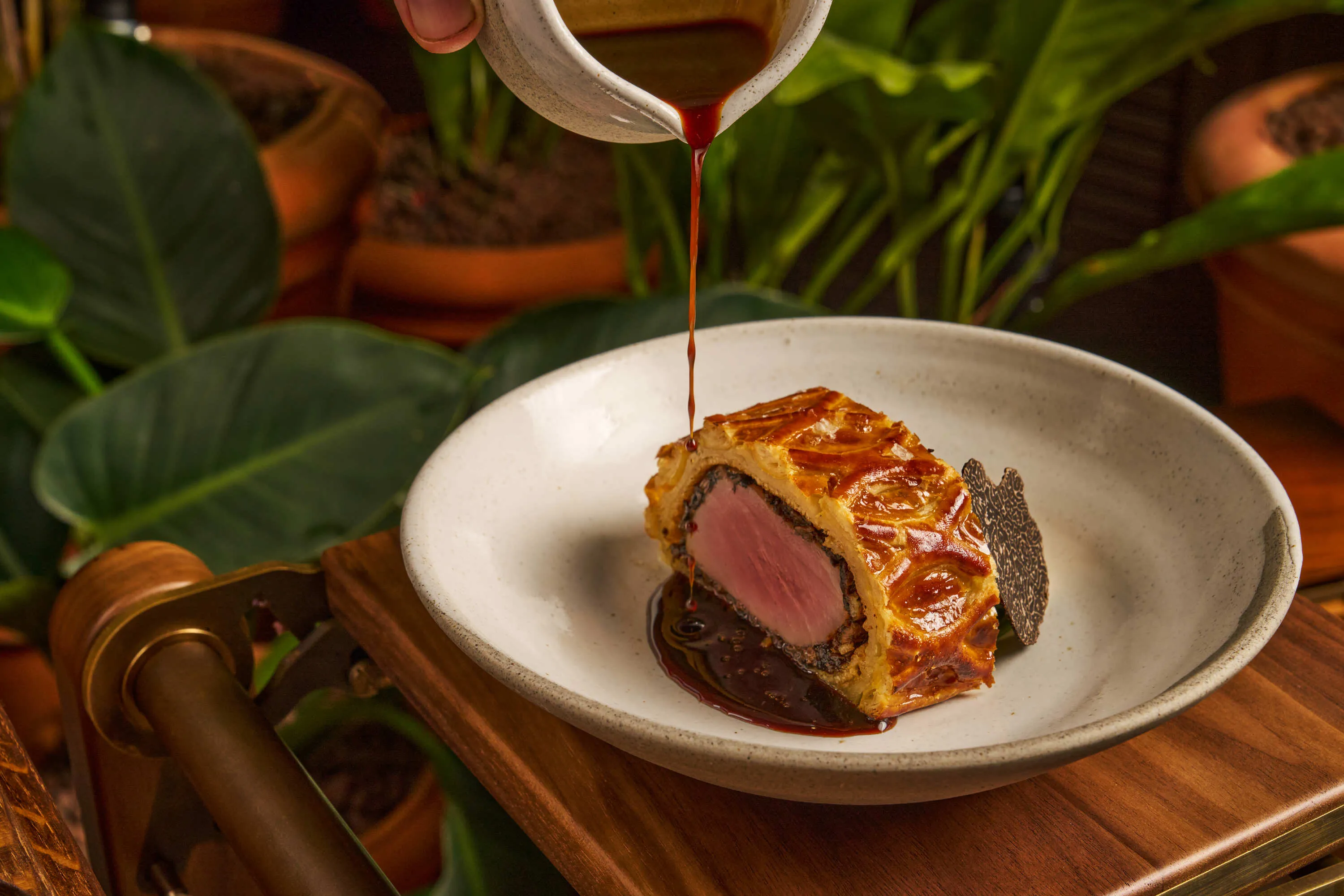 The highlight of the tasting menu is the Mooloolaba yellowfin tuna wellington – a spin on the classic steakhouse staple of beef wellington. The buttery fragrance of puff pastry greets your nose as soon as the wellington is wheeled out. Each slice is tinged a pale pink that slowly sunsets into a gorgeous reddish centre. And thanks to the naturally softer consistency of fish, the tuna is perfectly fork-tender.