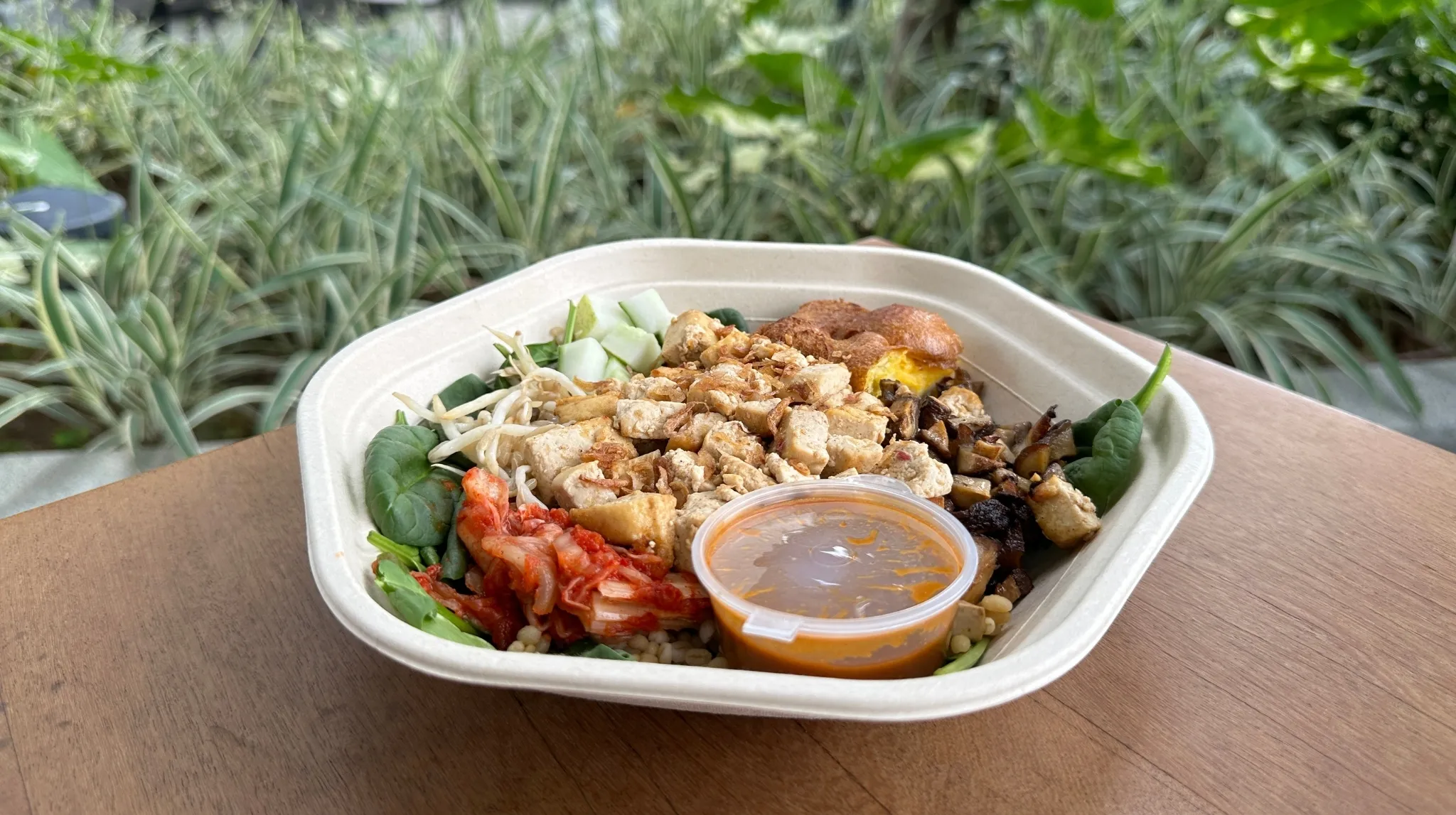 For more Asian-forward flavours, opt for the South Feast ($14) which includes tempeh, emping, fried shallots and bean sprouts with a spicy cashew dressing. The mix is reminiscent of Indonesian gado-gado salad and the tempeh and crushed emping lend an earthy, savoury touch to the dish. And our favourite of the bunch: the Allston ($16). This comes with a mix of greens, kimchi, and your choice of grain, and is topped with a moreish sesame ssamjang dressing.