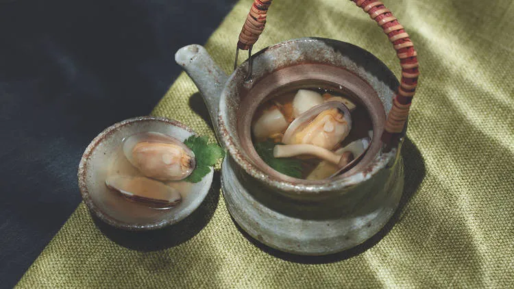 Then warm the belly with a series of cooked dishes. Sip on soup from a teapot, brimming with brine and sweetness from the addition of scallops, prawns, and clams. And from the grill counter, snack on smoke-kissed beef tenderloin, glazed with yakiniki sauce; or bite on tender chicken thigh with charcoal-infused sauce. Save room for the kaisen soy nabe, where seafood and sweet potato noodles are stewed in a soy milk broth.