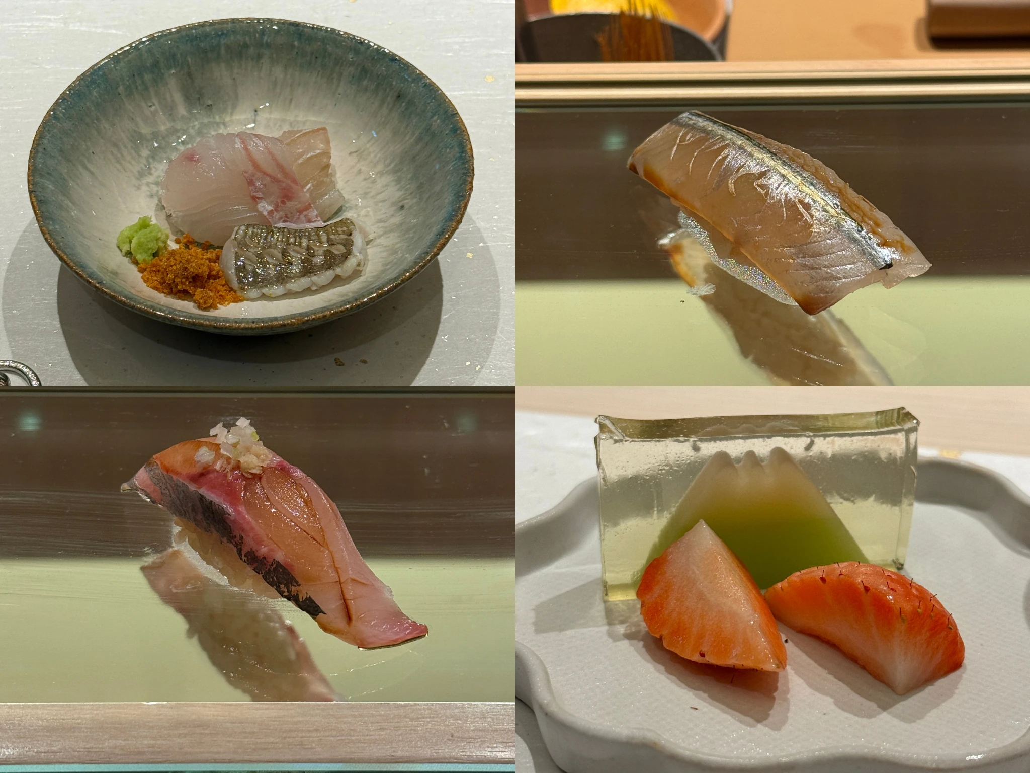 Then comes the main event: 10 pieces of perfectly crafted sushi. Each piece is presented on a glass counter with a mirrored underside – a setup that lets you inspect the sushi from every angle. You see the grain of the rice, the knife work, the structure and it matters, because the details are dialled in. The shari is the standout. Too often, sushi rice is either packed too tightly or falls apart at first touch. Here, it lands squarely in the middle – structured enough to hold, loose enough to dissolve gently on the palate.