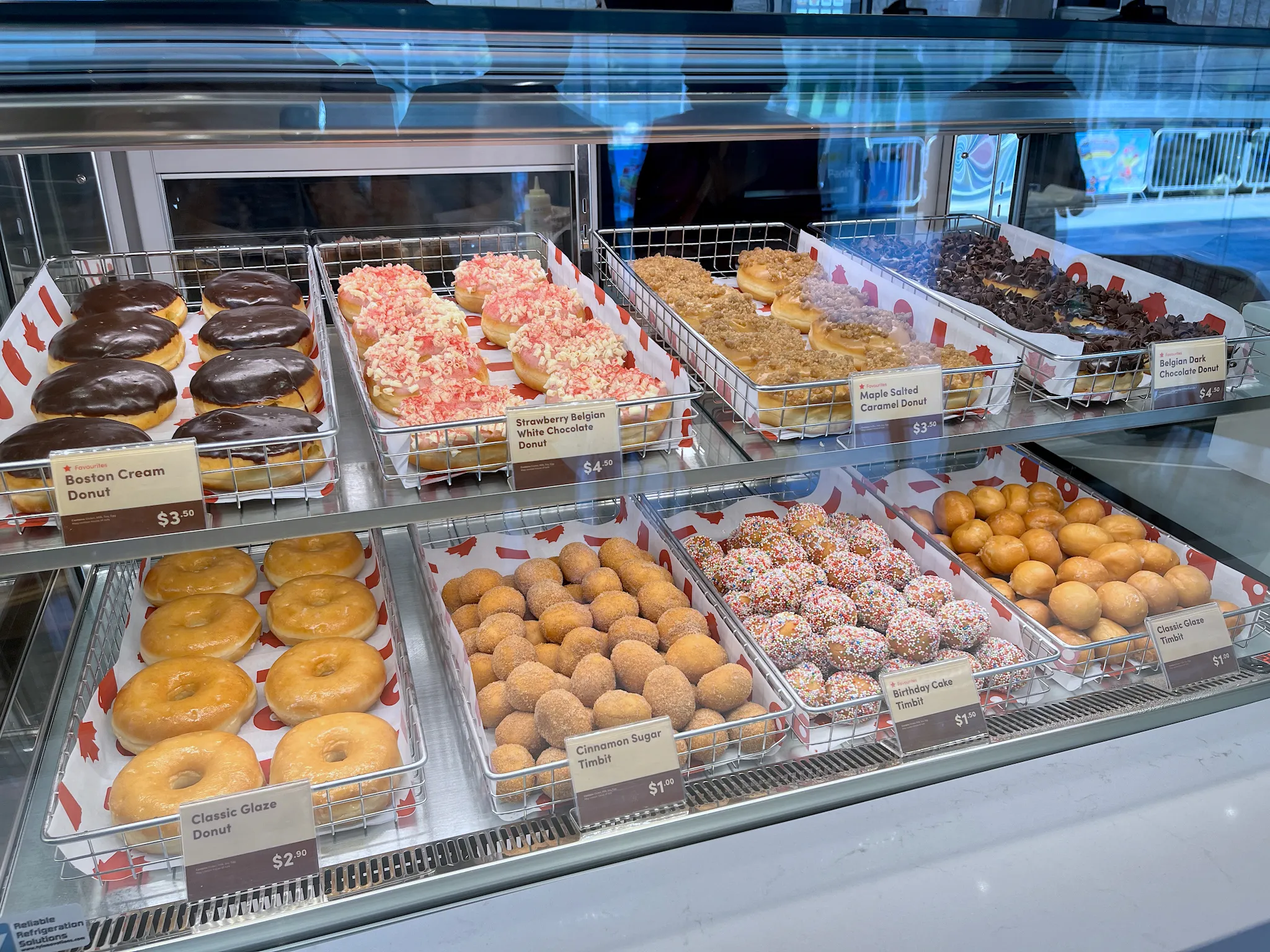 Want a tiny snack? Go for the Timbits, which are donut holes dusted with cinnamon sugar or rainbow sprinkles. Donuts are sold in packs of six ($20) and Timbits are sold in packs of 10 ($10).