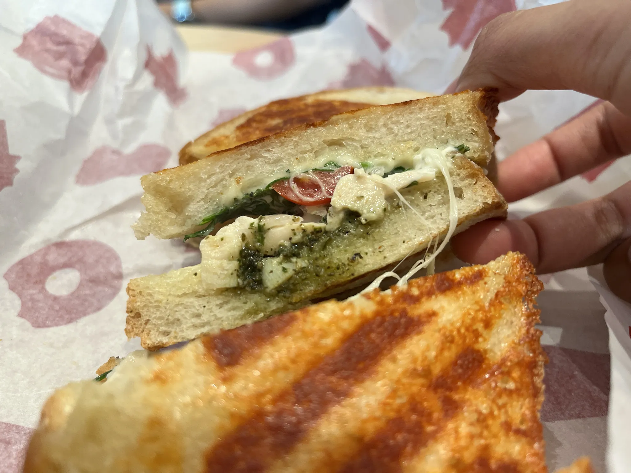 Need a quick lunch? Tim Hortons has savoury options too. Six sourdough melts make up the menu. Choose from truffle egg mayo cheese, triple cheese and caramelised onion, truffle mushroom, maple glazed chicken ham and cheese, tuna sriracha cheese, and pesto chicken mozzarella ($8.90-$9.90). The melts are lighter than you would expect and are made hot on the spot.