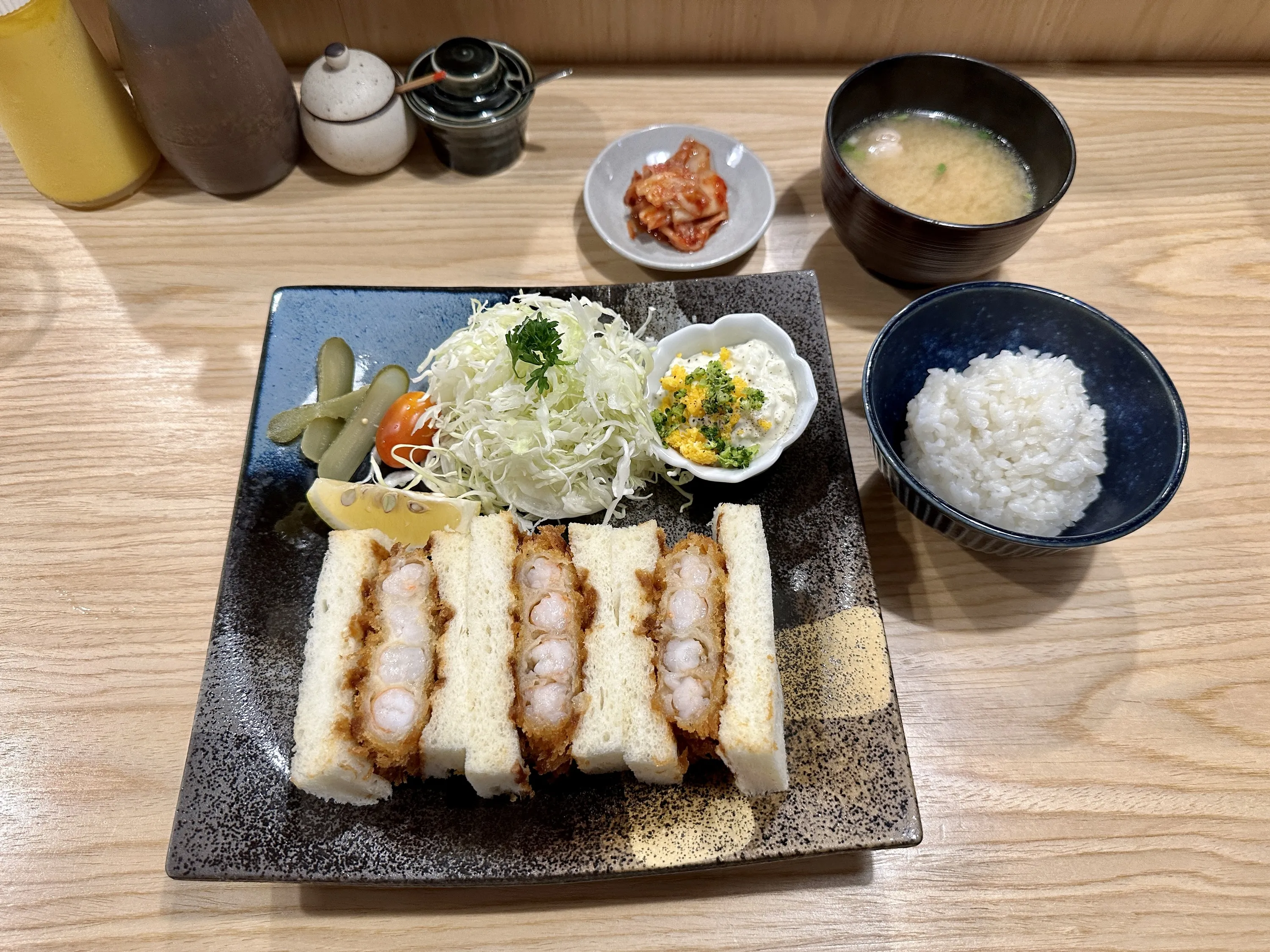 Curious as to how the Japanese black pork will fare, we also order the Hokkaido Kurobuta rosu katsu (pork loin, $32), only to find it slightly tougher than the tenderloin, with stringy bits of tissue making it hard to chew. For something different from the usual tonkatsu meal, Tonshou also offers katsu and ebi sando sets. Our choice is the ebi sando ($24), where succulent battered shrimp are encased in fluffy bread slices and paired with tartare sauce on the side.