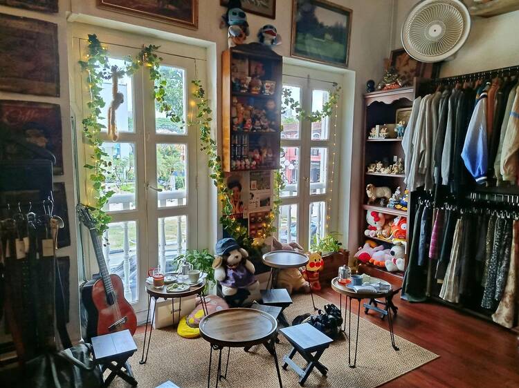 Tucked on the second floor of a North Bridge Road shophouse near Haji Lane, Takara House is a nostalgic little treasure trove where vintage fashion meets café culture. The young owners handpick pieces from Japan and Vietnam – leather jackets, embroidered vests, cottage-core dresses and cult Japanese labels like Axes Femme and Cecil McBee – all at thrift-friendly prices. Shelves brim with quirky finds too, from ceramic teacups and teddy-bear tapestries to Troll dolls, Happy-Meal toys and Pokémon cards. Adding to its charm, the in-house M.patisserie counter serves fresh bakes, making this a sweet, stylish hideout for thrifters and dessert lovers alike.