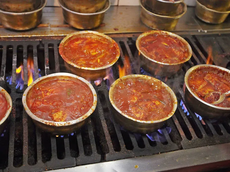 Namdaemun Market is filled with more than 10,000 stores and is famous not only for being the biggest market in the city but also for the variety of traditional dishes that it offers. Among the selection is braised cutlassfish cooked in Namdaemun’s cutlassfish alley. Built around 1988, this extensive division is filled with numerous eateries including Huirak Sikdang, which is known for its spicy red pepper braised cutlassfish served in a dented nickel-silver pot.
