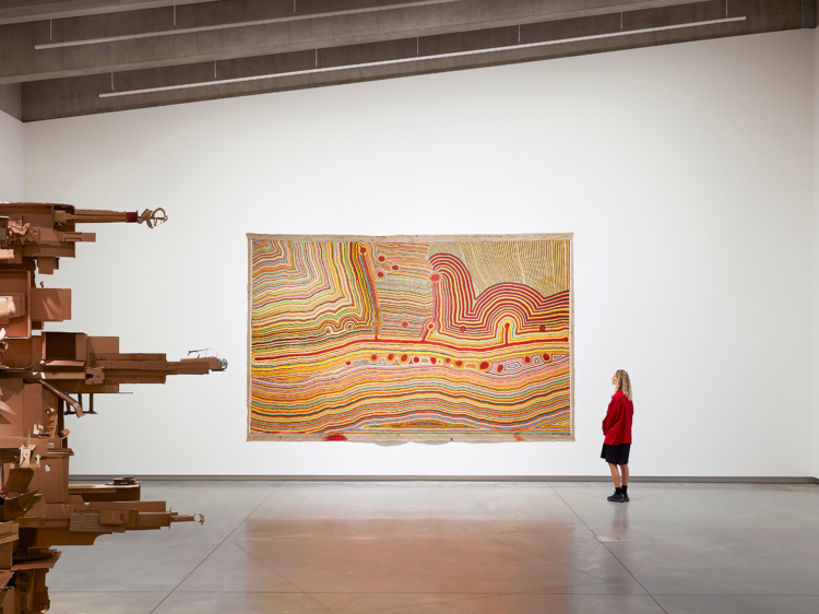 From large-scale paintings in traditional Indigenous art styles to experimental technologies, Thinking together: Exchanges with the natural world features new major commissions from contemporary artists and collectives that take a range of unexpected forms and unusual perspectives. For example, Greek-Australian artist and performer Tina Stefanou has been “collaborating” with retired horses for almost a decade, and these equine beauties are now the stars of ‘Horse Power’ (2019) – a video work in which we see them dressed in costumes festooned with jangling keys, creating freestyle percussion as they graze nonchalantly.