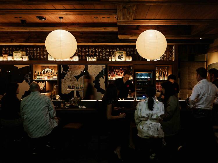 Lit by the soft glow of its looming orb lamps and cut-away drinks cabinets, subtle features will emerge slowly: hand-painted walls, collections of Japanese vinyls, rows of hanging patchworks, and stacks of swollen sake barrels (or kazaridaru).