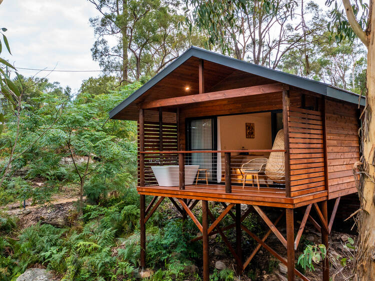 Hidden in the treetops, just a 45-minute drive from Sydney CBD in Maraylya, Billabong Retreat feels much further from the city than it actually is. As the name suggests, it overlooks a lotus-filled billabong, with 26 cabins and rooms spread across both sides.