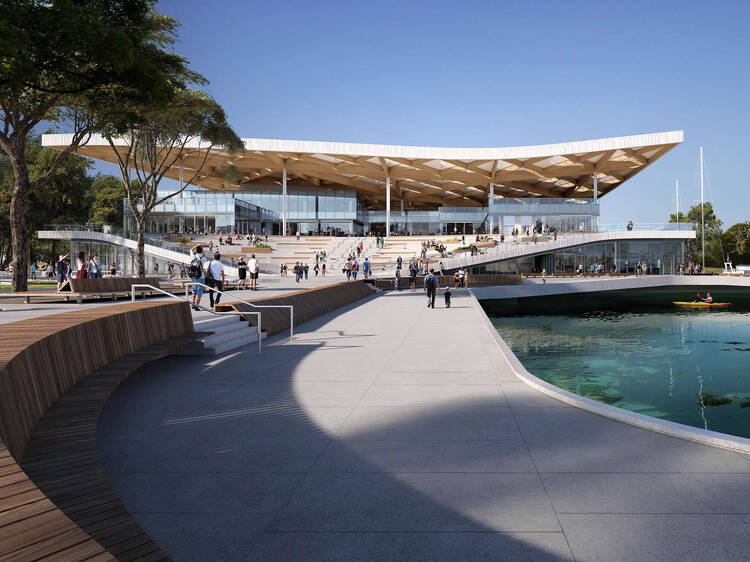 The huge new harbourside Sydney Fish Market will be a pearl in the transformed Blackwattle Bay oyster, complete with almost 1.5 acres of public space, new pedestrian and cycling links including a 15-kilometre connected waterfront promenade from Rozelle Bay to Woolloomooloo, and more than 1,000 new homes at the old fish market site.