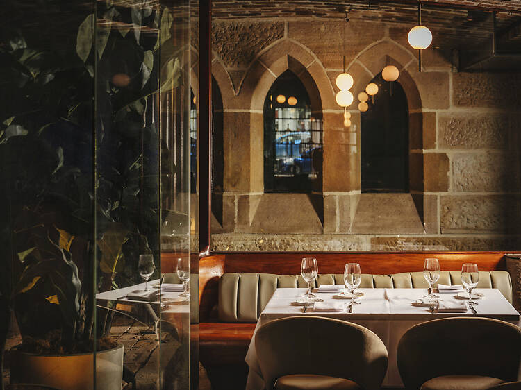 The design honours the building’s heritage, retaining the original convict-chipped sandstone, vaulted ceilings and tables hewn from a single native Coachwood tree.