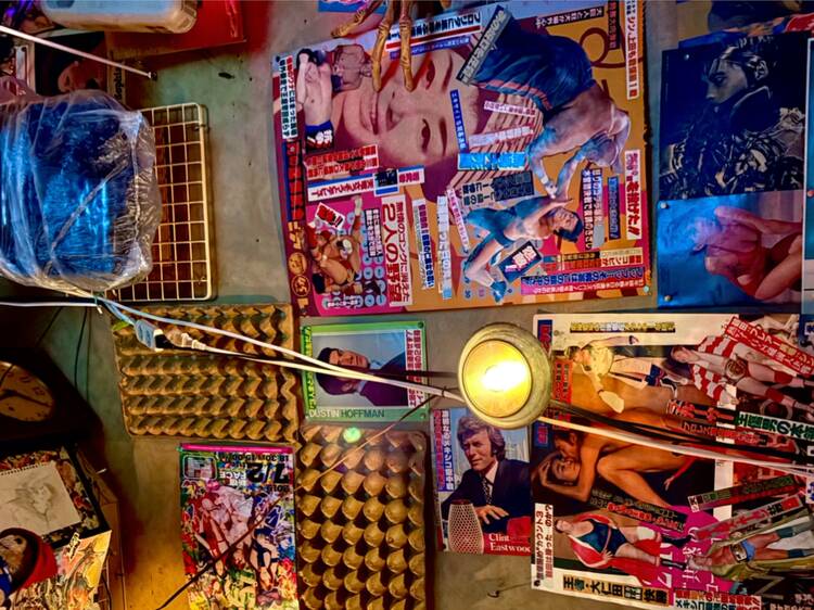 Descending into Gari Gari feels like falling down a rabbit hole of overstimulation. CRT televisions hum in the corners, CCTV monitors flicker with static, and every wall is covered in movie posters, pin-ups and strange ephemera.