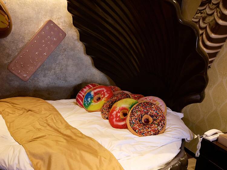 Sweets Hotel turns a stay into a sugar rush. The exterior announces itself before you've fully registered what you're looking at: a pink building studded with giant cookies, chocolate bars and cream puffs climbing the facade like architectural frosting. Inside, the rooms each commit to a different corner of the confectionery universe, but the presidential suite is the real cherry on top: a rooftop with a functioning merry-go-round, a pedal-powered rollercoaster, and a bed framed by an enormous dark chocolate clam shell. Before you even get to the room, you get to pick and choose at a complimentary candy bar complete with chocolate bath salts. Hansel and Gretel would have loved it here, though the door policy is strictly adults only.