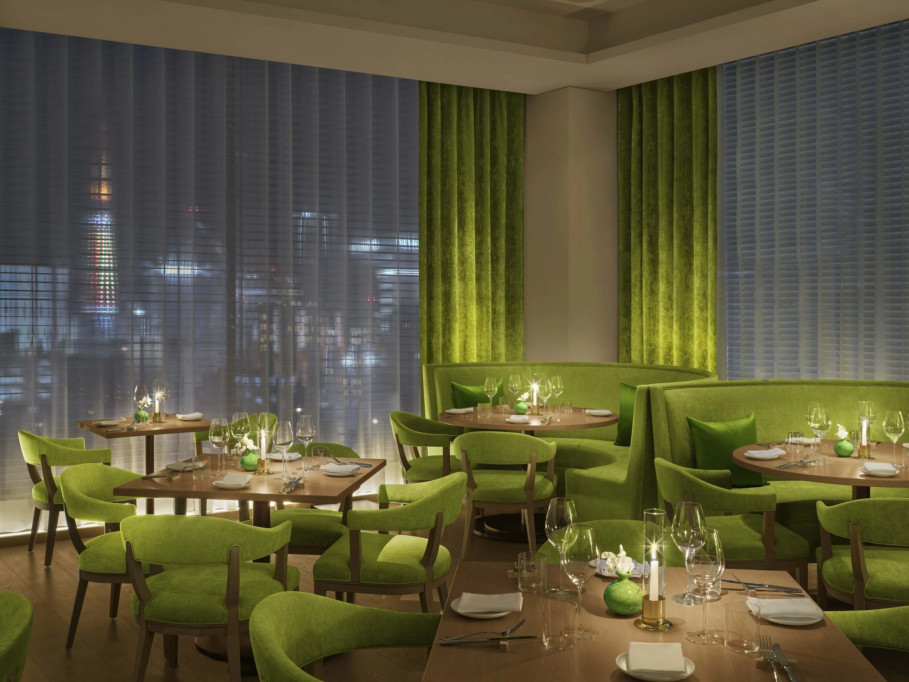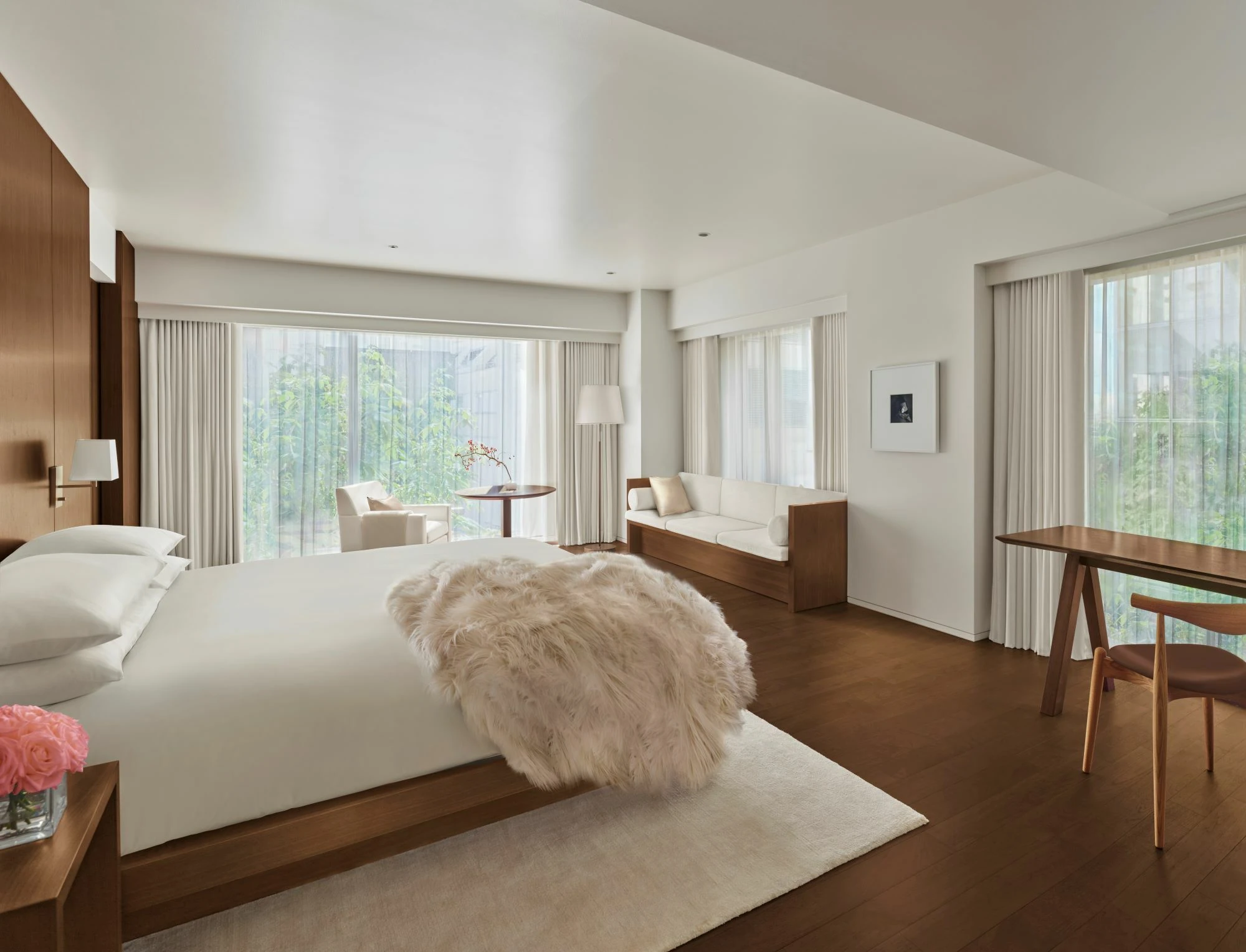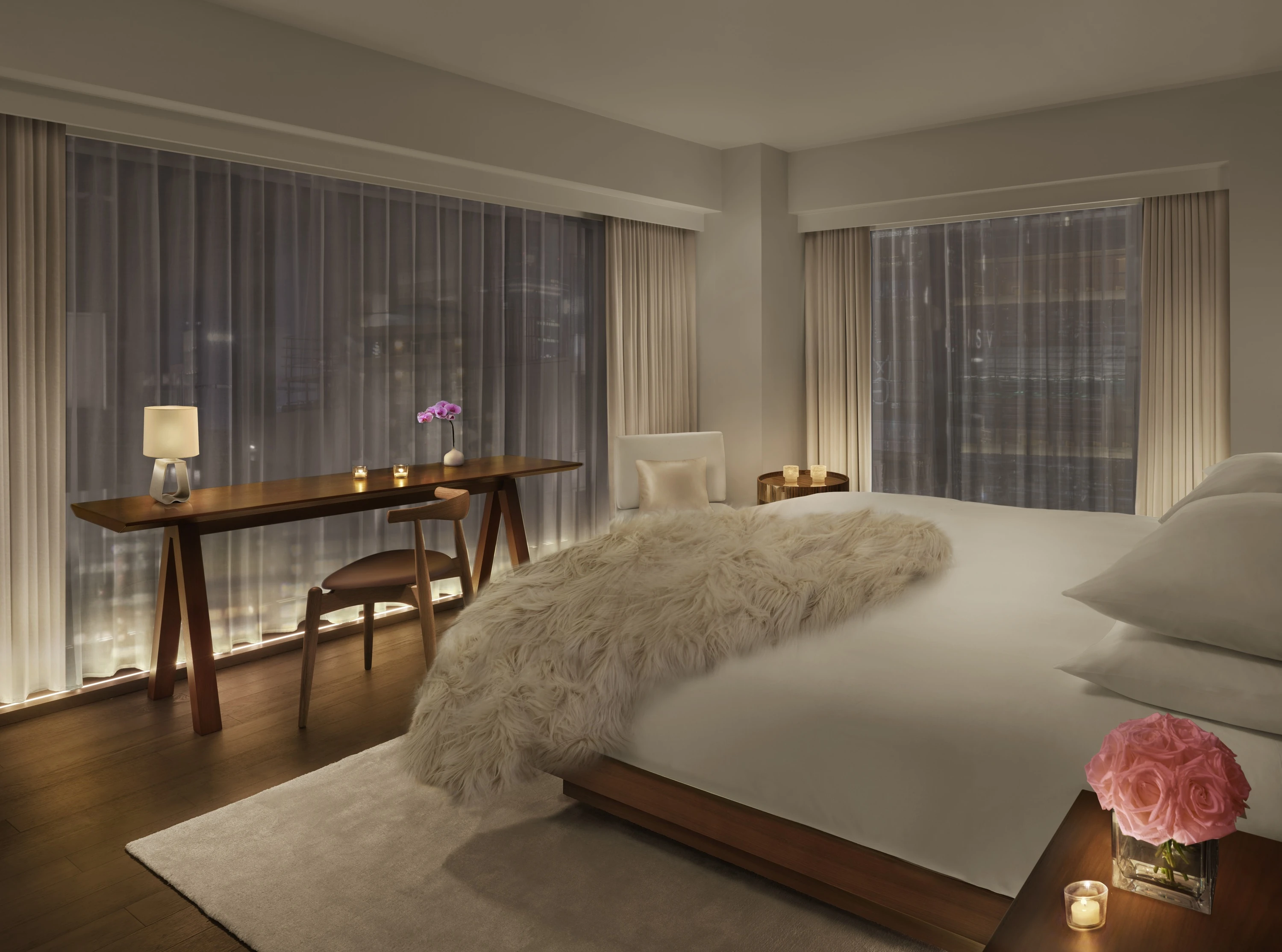 During my two-night stay in a Deluxe Room, I kept the window shades drawn for privacy. That being said, the more premium Superior and Premier rooms offer more square footage and larger seating options. All lodging types come with a Japanese-style wet room (combination bath and shower), plus Le Labo toiletries and other complimentary bath amenities. The neutral colour palette includes walnut wood accents and cream-coloured leather, plus a striking green marble countertop in the bathroom and the Edition’s signature faux-fur throw blankets.