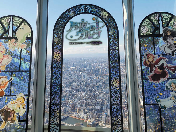 If a free souvenir is more your style, head to Floor 350, where Tokyo Skytree’s mascot Sorakara-chan makes sporadic appearances throughout the day, cosplaying as Madoka for the occasion.