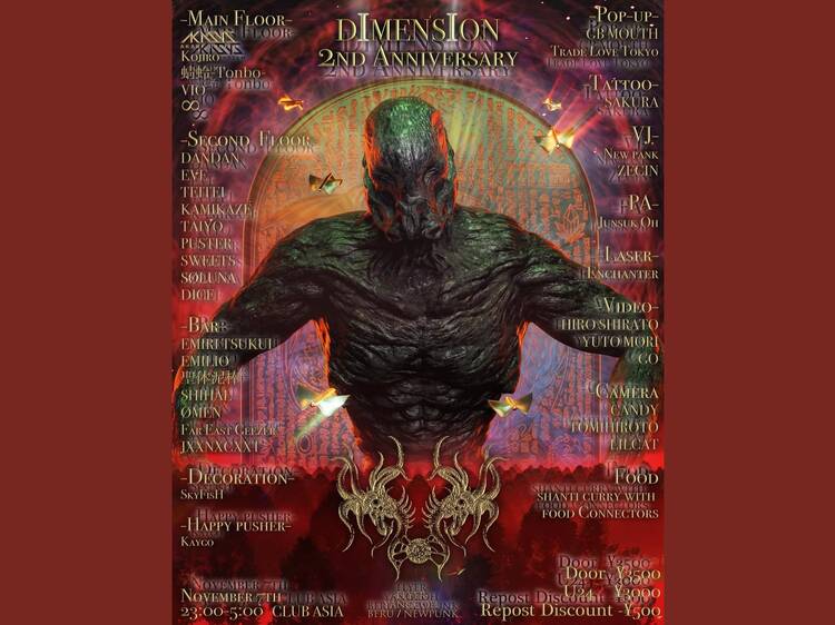 Dimension lands at Club Asia with its signature mix of club culture and design experiment. The line-up runs hard techno and electronic distortion, but the energy feels curated, not chaotic.