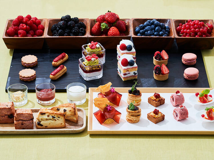 This afternoon tea at the Andaz Tokyo is all about the berries, with nine different fruits including strawberries, raspberries, blueberries, blackberries and haskap. On the trays you’ll find a decadent foie gras flan on a crispy brioche crouton covered in haskap syrup jelly, a mixed berry éclair, and a pistachio rouge made with layers of panna cotta, raspberry confit and pistachio crumble, among others.