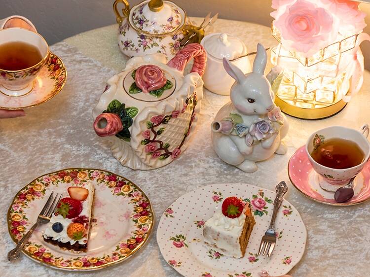 Every surface in Café Acorite is doing something. Shelves along the walls hold an absurd number of teapots: rabbits, cats and bears, yes, but also Chanel No. 5 bottles, tiny houses and food-shaped ones, all lit from behind like part of a collection that long ago spiralled into obsession. Red roses climb the exposed brick columns, your tea arrives in a pot that may have ears, and the cakes are as good as they are pretty. With its mismatched floral china, velvet tablecloths and every last corner packed with figurines, the whole place feels like cute-girl madness in the best possible way. Everyone is there for the photo, and unlike spots that act allergic to being treated as a backdrop, Café Acorite clearly welcomes it. Behind the bar, a small team in Ghibli-esque apron uniforms moves between cake mixers and teapots with the precision of a secret operation.