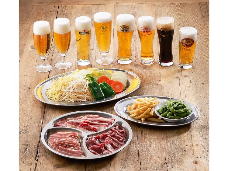The popular two-hour all-you-can-eat (¥5,980; ¥4,980 on Apr-Jun weekdays excluding hols) option includes everything from barbecue beef, pork and lamb to veggies, yakisoba noodles, fried garlic rice, sausages and even ice pops. It includes an all-you-can-drink selection of eight kinds of beers including Kirin and Heineken, in addition to whisky, sours, wine and soft drinks.